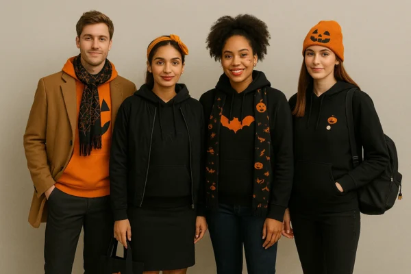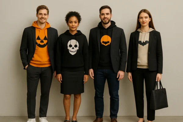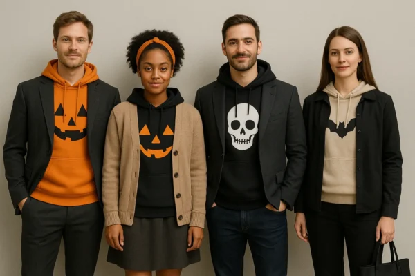 Styles that work well in professional or academic settings include hoodies with small embroidered details, tone-on-tone graphics, or clean illustrations that feel playful but polished. The goal is to show Halloween spirit without turning your outfit into a full-on costume.